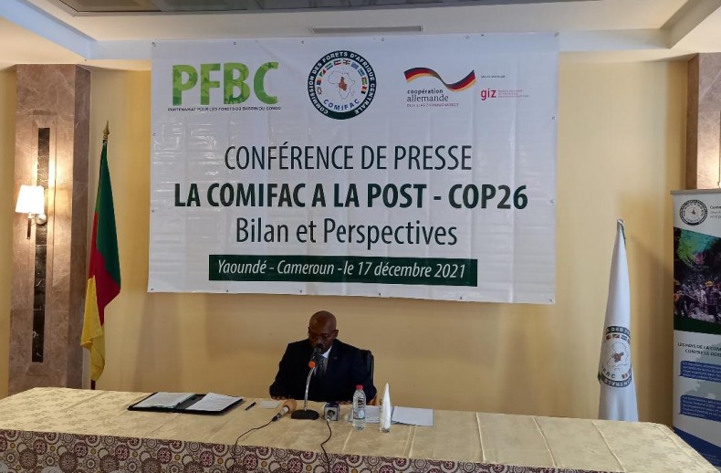 Yaoundé, Cameroun, 17 décembre 2021- Jules Doret Ndongo, le Ministre des Forêts et de la Faune (MINFOF) du Cameroun, en sa qualité de Président en exercice de la Commission pour les Forêts d’Afrique Centrale (COMIFAC), a donné une conférence de presse ce jour à l’hôtel Djeuga Palace. Cet échange avec la presse nationale et internationale, en présentiel et visio, a été l’occasion pour le Président de la COMIFAC de faire le point de la participation de cette structure sous-régionale qui regroupe onze pays (L’Angola, le Burundi, le Cameroun, le Congo, le Gabon, la Guinée Equatoriale, la République centrafricaine, la République Démocratique du Congo, le Rwanda, Sao Tomé et Principe et le Tchad) à la 26ème édition de la Conférence des Parties à la Convention Cadre des Nations Unies sur les Changements Climatiques tenue à Glasgow en Ecosse.